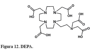Reubi y colaboradores90 reportaron complejos de 67Ga-DOTA con mejores propiedades farmacológicas. Donde la geometría de coordinación del radionúclido, incrementó la flexibilidad del ligando y permitió una mejor afinidad al sitio de enlace del receptor. Para un tratamiento en radioterapia seguro y potente se requiere un ligando que forme un complejo estable con una cinética de complejación clínicamente aceptable. Por lo que Chong y colaboradores,91 sintetizaron la segunda generación del DOTA, el DEPA (ácido (7- [2- bis- (carboximetil- amino)-etil]- 4, 10- bis- carboximetil- 1, 4, 7, 10- tetraza- ciclododec- 1-il)- acético), donde evaluaron la estabilidad del quelato con 177Lu, 212/213Bi y 205/206Bi (Figura 12).91