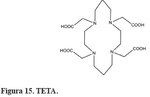 TETA (ácido 1, 4, 8, 11- tetraazaciclotetradecano- 1, 4, 8, 11-tetraacético) Figura 15,9 es uno de los agentes quelates más estudiados para cobre en el marcado de péptidos y anticuerpos en radioterapia. Se han sintetizado varios derivados de este, que se han utilizado en el desarrollo de conjugados de 67Cu con anticuerpos para el tratamiento de cáncer de colon.41,55,92,93 TETA también ha sido exitosamente utilizado como BFCA con análogos de la somatostatina.9