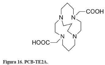 El grupo de Yoo94 en el 2012 reportaron la síntesis de un nuevo agente quelante tipo TETA. El PCB-TE2A puede acomplejarse con 64Cu (Figura 16) ,94 teniendo una muy alta estabilidad cinética y adecuada biodistribución, para ser utilizado como radiofármaco de marcado específico.