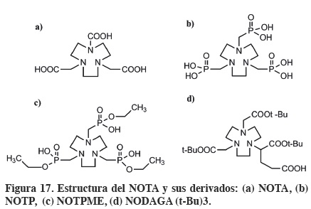 NOTA (ácido 1,4,7-triazaciclononano-1,4,7-triacético) Figura 17a junto con su derivado fosfonato NOTP (Figura 17b) y éster monoetil NOTPME (Figura 17c) fueron estudiados para su posible uso como radiofármacos.9 Se han reportado los complejos de estos agentes quelantes con 67/68Ga y 111in.85,93,95 Recientemente Jeong y colaboradores96 reportaron la conjugación de NOTA con el péptido cíclico Arg- Gly- Asp- D-Tyr- Lys [c (RGDyK)] y marcado con 68Ga para estudios de imagen de angiogénesis en el tejido isquémico, obteniendo un alto rendimiento de marcado y alta selectividad a los receptores del péptido cíclico.