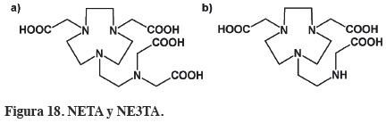 La segunda generación de NOTA fue preparada por Chong y colaboradores98 resultando NETA (ácido {4- [2- (bis-carboximetil- amino)- etil]- 7- carboximetil- [1.4.7]triazonan-1-il}-acético) y NE3TA (ácido {4-carboximetil-7- [2- (carboximetil- amino)- etil]- [1.4.7]triazonan-1-il}-acético) (Figura 18).91 Estos ligandos fueron evaluados como quelatos con varios metales (90Y, 205/206Bi, 203Pb, 177Lu y 64Cu) mostrando una buena afinidad por lo que se pueden utilizar en diagnóstico y terapia. En particular, los quelatos de NETA resultaron ser muy efectivos en radioinmunoterapia, donde se emplea un anticuerpo monoclonal para la entrega selectiva del radioisótopo citotóxico.