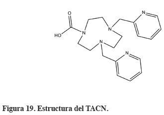 La tercera generación de estos compuestos fue recientemente propuesta por Gasser y colaboradores99 en el 2008, ellos sintetizaron un derivado del 1,4,7-triazaciclononano, (TACN) el ácido 2- (4, 7- bis- (2- piridilmetil)- 1, 4, 7- triazaciclononan- 1-il)-acético (Figura 19),99 que contiene tanto un grupo carboxílico para la unión covalente a la biomolécula como dos grupos secundarios piridil. Ellos realizaron el radiomarcado con 64Cu y su conjugación con un análogo de la bombesina en la radiodetección del cáncer pancreático. Gasser y colaboradores concluyeron que el bioconjugado presenta una alta estabilidad in vivo y rápida separación renal sin pérdida del radionúclido.
