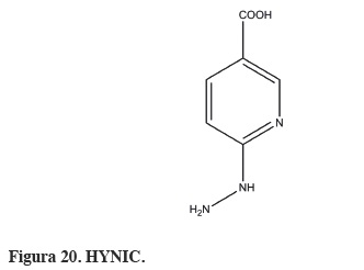 Abrams y colaboradores100 en 1990 fueron los primeros en reportar el uso de arilhidrazinas, incluyendo el ácido 4-hidrazinobenzoico (HYBA) y el ácido 6-hidrazinonicotínico (HYNIC) (Figura 20),9 como agentes quelantes bifuncionales para 99mTc y su conjugación con anticuerpos policlonales IgG.100,101 Desde entonces HYNIC se ha usado para el marcado de 99mTc con anticuerpos,102 péptidos,103 quimiotácticos,104 γ-globulinas,101,102 análogos de la somatostatina,104 receptores para ligandos folatos105 y polipéptidos.106-108