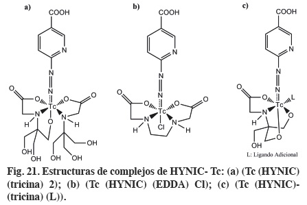 La ventaja de utilizar el HYNIC es su alta eficiencia de marcado. El arreglo estructural del HYNIC indica solo la presencia de dos sitios de coordinación del radionúclido. Por ello con un coligando como la tricina, ácido etilen-diamino-acético o glucoheptonato se coordina para completar la esfera de coordinación del radionúclido109,110 (Figura 21).9 La conjugación de los coligandos ayuda a modificar las propiedades farmacocinéticas del radiofármaco.