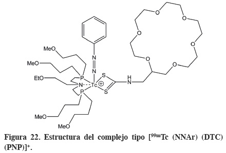 Recientemente se ha propuesto la síntesis de nuevos coligandos, para generar una nueva de clase de quelatos HYNIC, que contienen dentro de su estructura fenilhidrazina, un éter corona con ditiocarbamato y una difosfina conocida como PNP (Figura 22).108 La combinación de esos tres ligandos con el 99mTc resulta en la formación de complejos catiónicos que se pueden utilizar en el desarrollo de radiofármacos para imagen en diagnóstico de enfermedades cardiovasculares.