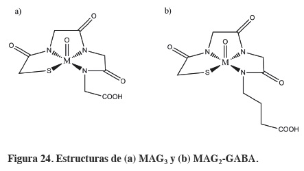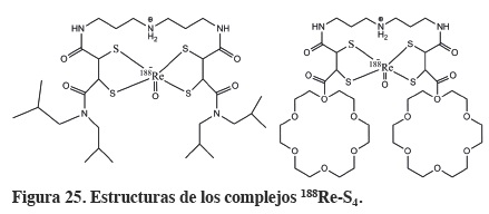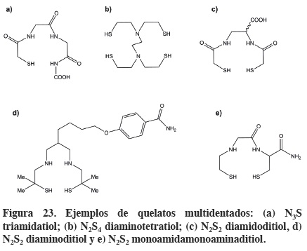 Dentro de los quelatos tetradentados se encuentran triamidotioles N3S, diamidaditioles N2S2 (DADS),114,115 N2S2 monoamidamonoaminaditiol (MAMA),116,117 diaminotetratioles N2S4,13 N2S2 diaminaditiol (DADT)3 (Figura 23)9 y un gran número de sus derivados, que contienen átomos de azufre y nitrógeno, incorporados en la estructura de estos quelatos. Los quelatos N2S4 contienen dos átomos donadores de nitrógeno amino y cuatro átomos donadores de azufre, los cuales se han utilizado para el marcado de anticuerpos con 99mTc y 186/188Re,36,118 la presencia de los grupos ti oles permite el acoplamiento con anticuerpos vía unión disulfuro.3