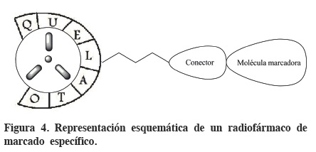 Los agentes quelantes bifuncionales han sido desarrollados para marcar biomoléculas, para el diagnóstico y terapia en vivo.41 A estos se les considera, la parte más importante de un radiofármaco de marcado específico, ya que coordina al radionúclido y se encuentra unido covalentemente a la molécula marcadora directamente o a través de un conector. En la figura 4 se muestra una representación esquemática de un radiofármaco de marcado específico (Figura 4).35