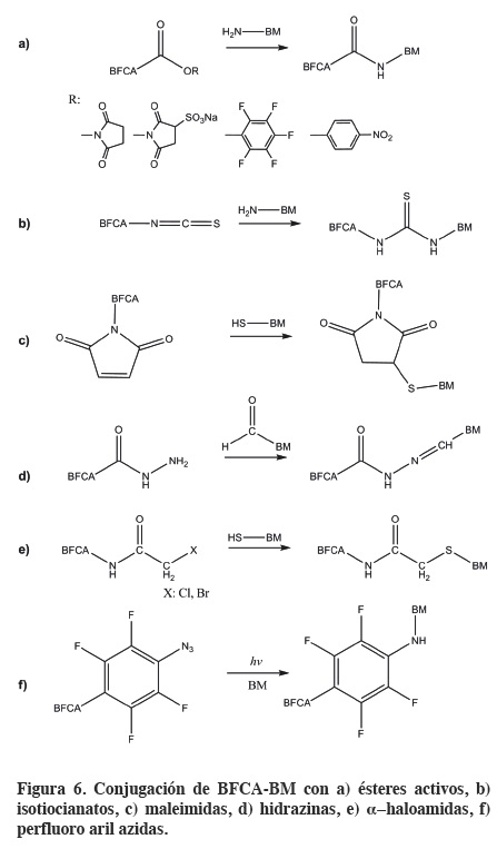 Los ésteres activos, isotiocianatos, maleimidas, hidrazidas, α-haloamidas y perfluoro aril azidas9 son grupos funcionales que pueden estar presentes en un BFCA ya que ayudan a la unión covalente de este con la biomolécula (Figura 6). Los ésteres activos se usan para formar un enlace amida entre un ácido carboxílico de un BFCA y un grupo amino de la biomolécula, dentro de los que se encuentran p-nitrofenil, pentafluorofenil, N- hidroxisuccinimida y sulfo- N- hidroxi-succinimida.