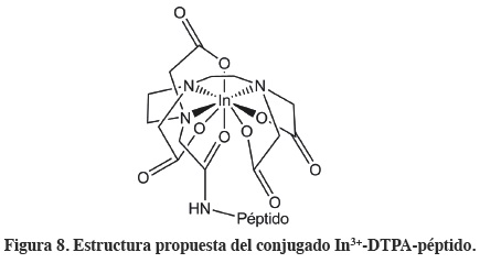 Un gran obstáculo en la eficiencia del radiomarcado con conjugados de DTPA es la presencia de metales traza en su preparación, ya que ellos compiten con los radionúclidos en el proceso de marcado. Para evitar esto, se debe de utilizar un exceso del péptido conjugado así como un radionúclido de alta pureza. Se ha visto que los derivados del DTPA pueden formar complejos estables con 111In (Figura 8),9 debido a que se coordina con ocho átomos donadores, de los cuales tres provienen del grupo amino, cuatro del grupo carboxílico, y el otro del oxígeno del carbonilo del grupo amida.76