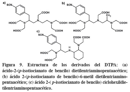 Una ventaja de usar análogos del DTPA es su rápida cinética de marcado con anticuerpos o fragmentos de anticuerpos debido a que son resistentes a altas temperaturas. Muchos grupos de investigación se han dedicado a la síntesis de conjugados DTPA-biomolécula para mejorar la estabilidad termodinámica y cinética con 90Y o 111In.41 Por lo que se han preparado derivados del DTPA, para desarrollar conjugados de primera (Figura 9 incisos a, b)9 y segunda generación (Figura 9c).9,77,78