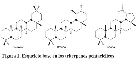 Los triterpenos (30 átomos de carbono) son compuestos naturales que se construyen a partir de seis unidades de isopreno. Los cuales se encuentran ampliamente distribuidos en el reino vegetal y desempeñan un papel importante en la naturaleza. Desde una perspectiva biológica, se asume que los esqueletos del olaneano, ursano y lupano son las más importantes dentro de los triterpenos, ver figura 1. Dichas estructuras policíclicas pueden encontrarse, ya sea en su estado libre o en forma de glicósidos. Como consecuencia, presentan una gran diversidad estructural. Hasta ahora, se conocen alrededor de 100 diferentes tipos de esqueleto en la naturaleza1-3 y cientos de derivados han sido sintetizados.4-5 Los efectos biológicos correspondientes a este tipo de compuestos son muy diversos y pueden ser resumidos como: anti-tumorales,6-10 anti-inflamatorios,11 anti-VIH,12-13 anti-microbianos,9 hepa14-15 y cardioprotectores,16 analgésicos, anti-micóticos, anti-quimiopreventivos,17 entre otros.18-20