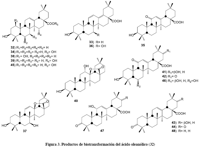 El ácido oleanólico (32) es un triterpeno que se encuentra ampliamente distribuido en las plantas en forma libre o glicosilada. Se ha informado que 32 presenta una amplia actividad biológica, donde destaca: hipo-glicémica, hipo-lipidémica, hepaprotectora, anti-inflamatoria, anti-viral, anti-oxidante, anti-carcinogénica, entre otras. De la biotransformación del ácido oleanólico por Cunninghamella blakesleeana se aislaron los ácidos 3β-hidroxioleana-11, 13(18)-dien-28-oico (33), 3β, 7β-dihidroxiolean-12-en-28-oico (34), 3β-hidroxi-11-oxoolean-12-en-28-oico (35), 3β, 7β-dihidroxioleana-11, 13(18)-dien-28-oico (36), 3β, 7β, 13β-trihidroxiolean-11-eno-28, 13-lactona (37) y 1β, 3β-dihidroxiolean-12-en-28-oico (38),32-33 como se muestra en la figura 3.