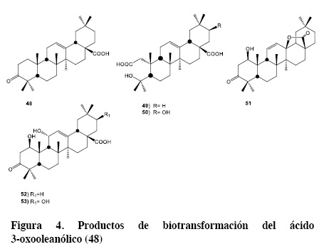 El ácido 3-oxolean-12-en-28-oico (48), derivado oxidado de 32 en C-3, fue biotransformado por Chaetomium longirostre (RF-1095) al ácido 4-hidroxi-3, 4-seco-olean-12-eno-3, 28 dioico (49) y al correspondiente 21β-hidroxiderivado (50),45 ver figura 4.