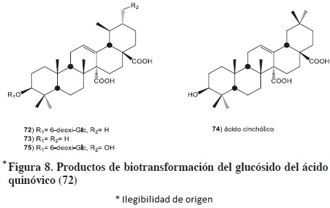 El glucósido del ácido quinóvico (72) es el principal constituyente de la corteza del árbol Mitragyna inermis, importante especie vegetal empleada en la medicina tradicional de África del Este para el tratamiento de enfermedades del aparato digestivo, desordenes intestinales y enfermedades del hígado. El sustrato 72 fue desglucosilado por Nocardia sp (NLRR 5646) para dar la mezcla de ácidos quinóvico (73, 40%) y cinchólico (74, 20%);51 los cuales tiene una biosíntesis común. La formación de 74 puede explicarse vía la migración de un grupo metilo, similar a la observada en la conversión del ácido ursólico (59) a ácido oleanólico (32) por el mismo microorganismo.39 Por otro lado, la biotransformación de 72 con Streptomyces griseus (ATCC 13273) condujo a la formación de un nuevo producto de oxidación (75), como resultado de la hidroxilación del C-30, figura 8.56
