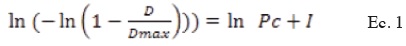 Dónde: D es la dureza o Resistencia a la ruptura de las tabletas, Dmax es la dureza máxima alcanzada por las tabletas, Pc es la presión de compactación, n es la pendiente de la curva e I es el intercepto de la curva.