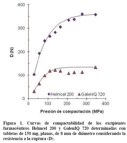 La figura 1 muestra los datos experimentales y la curva de compactabilidad calculada para tabletas planas de 8 mm de diámetro de GalenIQ 720 pesando 150 mg. En la misma figura se muestra, como referencia, los datos experimentales y la curva de compactabilidad calculada para Helmcel 200. La caída de la dureza de las tabletas de GalenIQ 720, a presiones de compactación intermedias, se atribuye a cierta laminación de las tabletas debido a que utilizó el excipiente puro, sin el lubricante necesario.