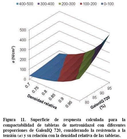 El efecto conjunto de la presión de compactación y de la proporción de GalenIQ 720 sobre la resistencia a la tensión (σ) de tabletas de Metronidazol se observa en la figura 11. La superficie de respuesta calculada muestra la porción del sistema formado por metronidazol-GalenIQ 720 correspondiente a la fase continua del excipiente (75-95% de GalenIQ 720).