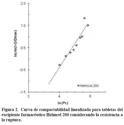El logaritmo de la resistencia a la tensión contra la densidad relativa de la tableta daría una relación lineal. Este tratamiento de los datos experimentales permite calcular la compactabilidad como la resistencia a la tensión de tabletas con una porosidad de cero o con una densidad relativa de 1 (σmax) y con la pendiente (k). Esta última, se dice que es indicativa de la capacidad del polvo considerado para formar enlaces entre las partículas. Un valor alto de k correspondería a una unión fuerte de las partículas primarias.16