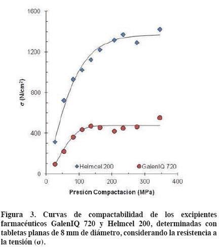 En la figura 3 se muestran los datos experimentales y las líneas de regresión calculadas para la relación entre la resistencia a la tensión de las tabletas de GalenIQ 720 y de Helmcel 200 y la presión de compactación utilizada para obtenerlas.