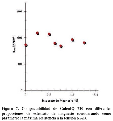 En la figura 7 se presentan los datos experimentales obtenidos para la resistencia a la tensión (σmax) para el GalenIQ 720, en función de la proporción de estearato de magnesio en sus mezclas. Como se puede observar, los resultados muestran la misma tendencia ya observada en la figura 5.