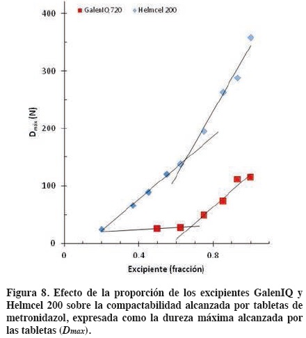 En la figura 8 se observa también que a proporciones bajas de Helmcel 200, con una fase continua de metronidazol, el aumento progresivo de la proporción del excipiente produce un incremento en la dureza de las tabletas de las mezclas. Sin embargo, esto no ocurre en las mezclas con GalenIQ 720. Una fase continua de metronidazol no permite apreciar prácticamente ningún efecto del GalenIQ 720 para aumentar la compactabilidad de las mezclas.