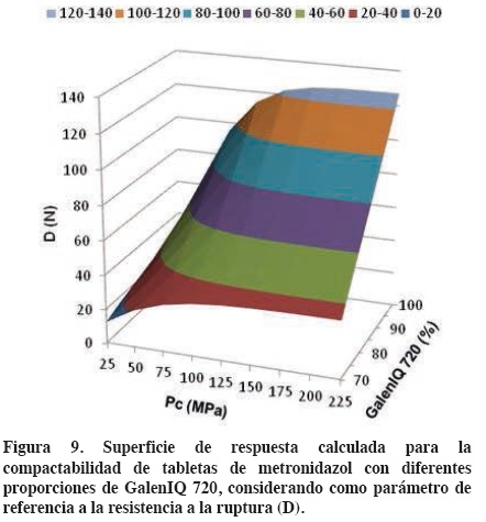 En la figura 9 se puede observar el efecto conjunto de la presión de compactación y de la proporción de GalenIQ 720 sobre la compactabilidad de tabletas de metronidazol. En este caso tomando como parámetro de compactabilidad a la resistencia a la ruptura de las tabletas (D). Las proporciones del excipiente que se consideraron son las que forman una fase continua del mismo (70-95%).
