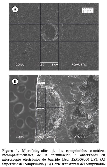 La perforación de los comprimidos osmóticos se realizó de forma manual por medio de un taladro con una broca de 1 mm y con profundidad mayor al espesor de la membrana semipermeable (mayor a 300 µm). Se tomaron microfotografías del orificio y espesor de la película de recubrimiento mediante un microscopio electrónico de barrido (Jeol JSM-59000 LV).