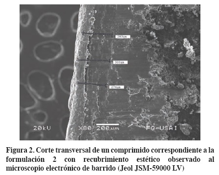 En el recubrimiento estético se utilizó un OPADRY II Green con un aumento en peso del 3 %. En la figura 2 se muestra el corte transversal de un comprimido de la formulación 2 con la membrana semipermeable y el recubrimiento estético, observándose un espesor de membrana entre 274 y 303 µm. Este espesor de membrana se encuentra dentro de los valores reportados por Baena y cols. (2006), que para tener una membrana funcional, con resistencia mecánica y enzimática al tracto gastrointestinal, ésta deberá poseer un grosor de entre 200 y 300 µm.9,17