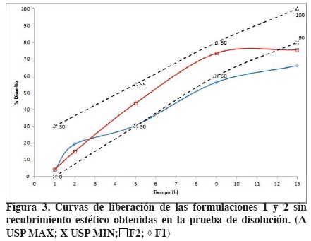 El recubrimiento considerado inicialmente como estético resultó que tiene un efecto importante en la liberación obteniendo velocidades de liberación más altas y mejores correlaciones. Esto se puede atribuir a que la membrana es más resistente y permite alcanzar y mantener por más tiempo un gradiente osmótico alto en el interior del sistema permitiendo obtener un perfil de liberación más uniforme y que cumple con los requisitos que marca la USP.