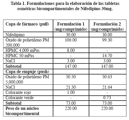 Las materias primas correspondientes a la capa de fármaco se mezclaron por 12 minutos en un mezclador de pantalón de 500 ml y de esta mezcla se pesó la cantidad correspondiente a la primera capa (147 mg) y se comprimió a 0.75 toneladas por 10 s en una prensa hidráulica (Carver, modelo 3912) usando una matriz de 10 mm de diámetro, para obtener núcleos de 220 mg y lotes de 200 núcleos bicompartimentales por formulación. Las formulaciones utilizadas en la elaboración de las tabletas bicompartimentales se muestran en la Tabla 1.