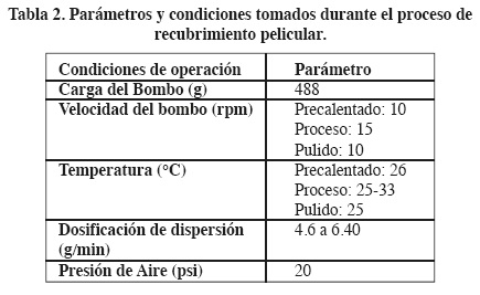 El proceso utilizado en la formación de la membrana semipermeable a los comprimidos bicapa fue el de recubrimiento pelicular en bombo convencional Erweka de 15 litros. Las condiciones empleadas durante el proceso se muestran en la Tabla 2. Las tabletas de los dos lotes se colocaron en el bombo y se adicionaron tabletas placebo de mayor diámetro para llegar al peso de 488 g.