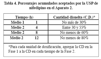 Se prepararon dos soluciones estándares, una con el Medio 1 y otra con el Medio 2, empleados en la prueba de disolución, ambos con una concentración conocida de Nifedipino (0.034 mg/mL), el Nifedipino fue solubilizado con 10 mL de metanol y se aforó a 250 ml.13 Las muestras y soluciones estándares se leyeron en un espectrofotómetro de UV-Visible (Cary 50, Varian) a una longitud de onda de 238 nm.13 Los criterios de aceptación fueron los mismos que los sugeridos por la USP 33, ver Tabla 4.