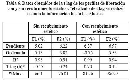 En todos los sistemas el tiempo de latencia (t lag) obtenido es menor a una hora por lo que se puede suponer que la membrana osmótica se hidrata rápidamente sin retrasar el inicio de la liberación y permite rápidamente al agente osmótico iniciar su efecto. (tabla 6) La rápida hidratación también puede deberse a que los polímeros en el interior del sistema captan rápidamente agua del medio y la introducen al interior del núcleo facilitando la acción del agente osmótico.