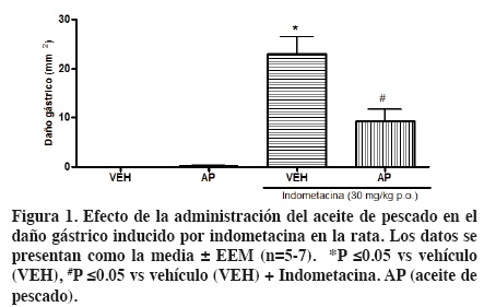 En nuestro estudio el daño gástrico generado por la administración de indometacina fue evaluado, después de administrar oralmente aceite de pescado durante 10 días. Nuestros resultados muestran que este tratamiento generó un efecto gastroprotector contra el daño producido por indometacina.