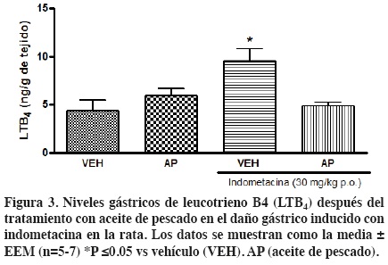 Por otro lado, los niveles gástricos de LTB4, se incrementaron significativamente después del daño generado con indometacina (9.5 ± 1.2 ng/ g de tejido), comparado con el vehículo (4.3 ± 1.1 ng/ g de tejido) y la administración sola de aceite de pescado (5.9 ± 0.7 ng/ g de tejido). Interesantemente el pretratamiento con aceite de pescado bloqueó el incremento de LTB4 inducido por la administración de indometacina (4.9 ± 0.3 ng/ g de tejido) (Figura 3).