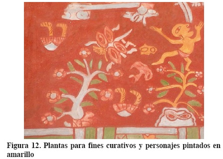 Desde el punto de vista farmacéutico, en el mural hay un componente aparentemente nuevo: el uso de plantas para fines curativos y aplicadas por personajes pintados en amarillo.8, 11 Figura 12.