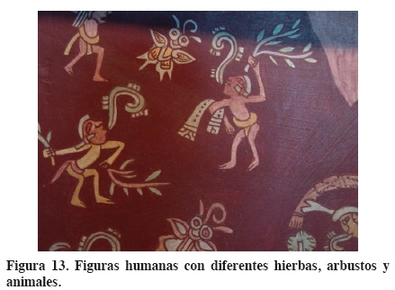 Mezcladas con las figuras humanas están representadas diferentes hierbas y arbustos, de donde el médico-farmacéutico teotihuacano sacaba los elementos indispensables para su arte.8, 11, 14 Figura 13.