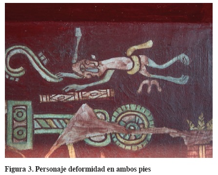 En el mismo templo hay otro mural que muestra a un personaje, cuya figura está bastante deteriorada, pero se puede distinguir en el pie izquierdo una deformación semejante al personaje referido anteriormente.9 Estas anomalías físicas son conocidas como pie equinovaro, una elevación anormal del talón o del lado interno del pie.10 Figura 2.