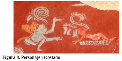 En el extremo superior derecho del mural, está pintado en rojo, un personaje desnudo, acostado boca arriba sobre una cama decorada, dando la apariencia de estar enfermo, tiene los brazos hacia atrás y de su boca salen 2 vírgulas.8, 11 Figura 8.