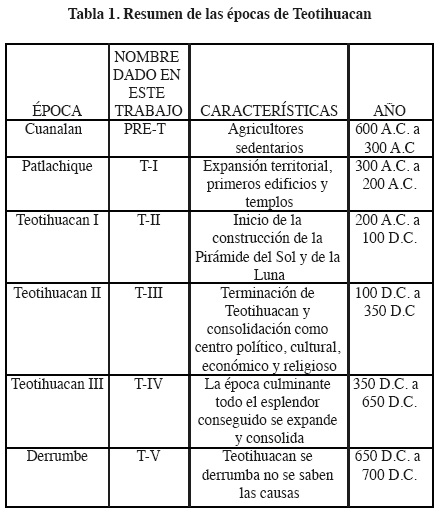 Las investigaciones arqueológicas muestran que Teotihuacan pasó por varias etapas evolutivas.1, 2, 3 Tabla 1.