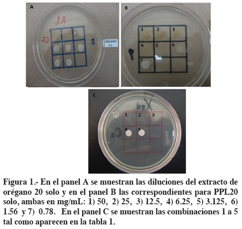 Aunque se han reportado combinaciones exitosas de propóleo con otros compuestos24, 25 o bien, orégano con otros compuestos,26 al parecer no hay reportes de trabajos en relación a la combinación de extractos de propóleo y orégano en contra de cepas SARM. Dado que ambos son coincidentes en sus formas de acción (principalmente debilitamiento de la pared celular), es de esperarse que combinaciones de ambos pudieran potencializar el efecto inhibitorio. El objetivo del presente trabajo fue evaluar los efectos inhibitorios de extractos etanólicos de orégano (Lippia graveolens Kunth s.l.) y extractos etanólicos de propóleo (Propolis) contra cepas SARM, por separado y en forma combinada.
