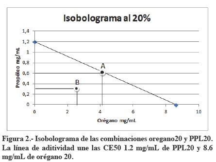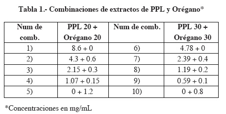 Combinaciones: Con el fin de evaluar las combinaciones entre los extractos de propóleo y orégano se siguió la metodología descrita por Talladira30 para estudios isobolográficos. Se ha demostrado que este método es sencillo y objetivo para evaluar combinaciones de fármacos. La línea de aditividad se estableció en base a la CE50 promedio de las cepas estudiadas. La tabla 1 muestra la serie de combinaciones establecidas para dichas combinaciones.
