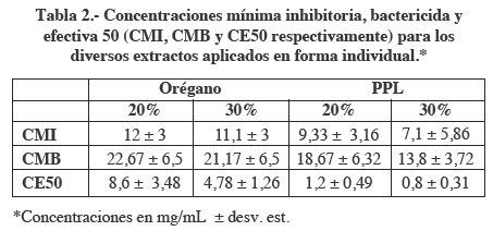 Los resultados muestran una diferencia significativa (p<0.05) entre los efectos inhibitorios de los diversos extractos aplicados de forma individual, siendo el más efectivo el propóleo al 30%, (Tabla 2).
