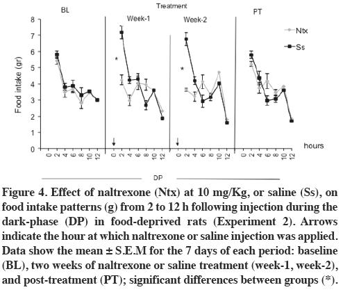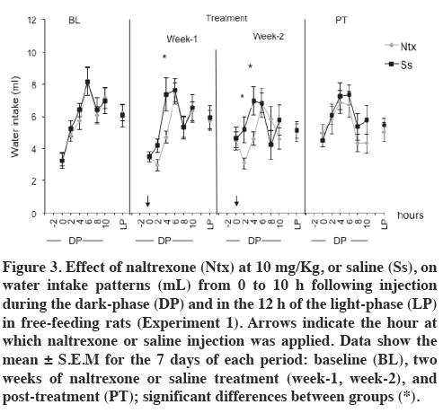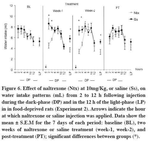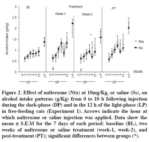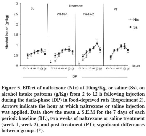 It is important to point out that the main objective of this study was to analyze the consumption patterns of alcohol and primary incentives such as food and water after a single daily dose of naltrexone. The rationale was that the kinetics described for this opioid receptor antagonist could generate a differential action throughout the day, and that food deprivation might be an additional factor in the possible differential effect of the drug.