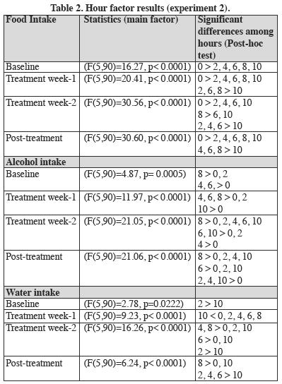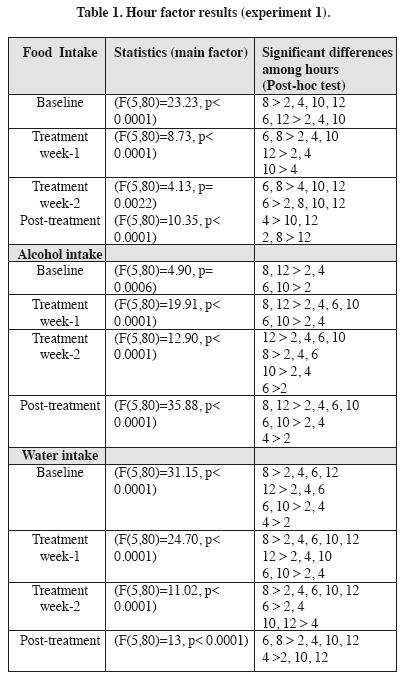 The factor of hours was significant in all experimental periods and in all the variables analyzed (food, alcohol and water intake). In order to facilitate the description of this factor, the statistical data and multiple comparisons that resulted from the post-hoc test are shown in Table 1.
