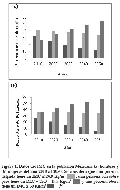 En el 2013 se realizó un estudio en hombres y mujeres en donde se calculó el incremento de IMC en la población Mexicana a partir del año 2010 y haciendo una extrapolación al año 2050, y se observa una tendencia en el incremento de la obesidad (Figura 1).16