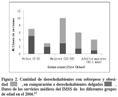 En el sector salud, de los 32,922,066 derechohabientes que hicieron uso de los servicios médicos del Instituto Mexicano del Seguro Social (IMSS) en el año 2006; mujeres, hombres y adultos mayores de 60 años presentaron mayor porcentaje de sobrepeso y obesidad (Figura 2).17