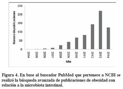 De acuerdo con el Centro Nacional de Información en Biotecnología (NCBI por sus siglas en inglés) del Instituto Nacional de Salud (NIH, USA), los primeros estudios de obesidad se empezaron a publicar en 1880 y las publicaciones sobre microbiota intestinal iniciaron en el año de 1984. El creciente interés de la comunidad científica internacional por el estudio de la microbiota intestinal y la obesidad se muestra con el aumento significativo de artículos publicados como se observa en la Figura 4. Bäckhed et al.44 en el año 2004, reportaron la relación que existe entre la acumulación de grasa y la microbiota intestinal. Los autores trasplantaron la microbiota intestinal de ratones normales a ratones libres de gérmenes utilizados como receptores y observaron un incremento del 47% en la acumulación de grasa corporal sin un aumento en el consumo de alimentos. De ahí surgió la hipótesis de que la composición de la comunidad microbiana intestinal incrementa la extracción de energía de los alimentos que produce el aumento de grasa corporal. En la Tabla 445-55 se mencionan otros estudios de la relación de la microbiota intestinal con la obesidad.