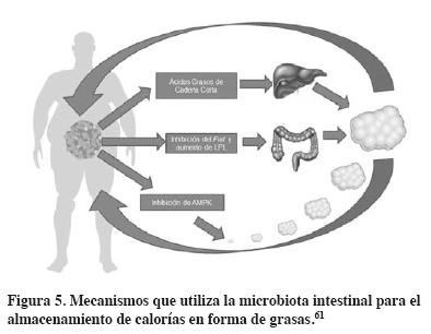 La microbiota intestinal y su efecto en la obesidad es debido a las actividades metabólicas de las bacterias, que tienen la capacidad de extraer energía a partir de los alimentos, que ayuda a su proliferación y almacenamiento de calorías en tejido adiposo.56,57 Existen tres mecanismos implicados en el almacenamiento de calorías en forma de grasa.