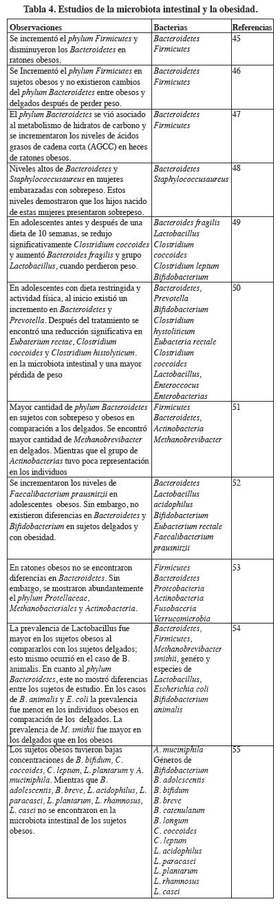 La obesidad es el resultado de un desequilibrio entre ingesta y gasto de energía, más la información genética y el estilo de vida se genera un incremento en el peso y la grasa corporal. México ocupa el primer lugar en obesidad con una prevalencia de 33 %. La atención médica para un individuo obeso representa el doble de gasto económico que para una persona sana. Esta patología se encuentra relacionada con enfermedades cardiovasculares, hipertensión, cáncer y diabetes mellitus tipo 2. Últimamente, la obesidad se ha relacionado con la microbiota intestinal y una proporción alterada de dos grupos microbianos dominantes; los Firmicutes y los Bacteroidetes. Este desbalance a favor de los Firmicutes, considerados como extractores de energía por sus actividades enzimáticas y junto a la alta ingesta de alimentos, se considera como factores que influyen en la obesidad de los individuos.